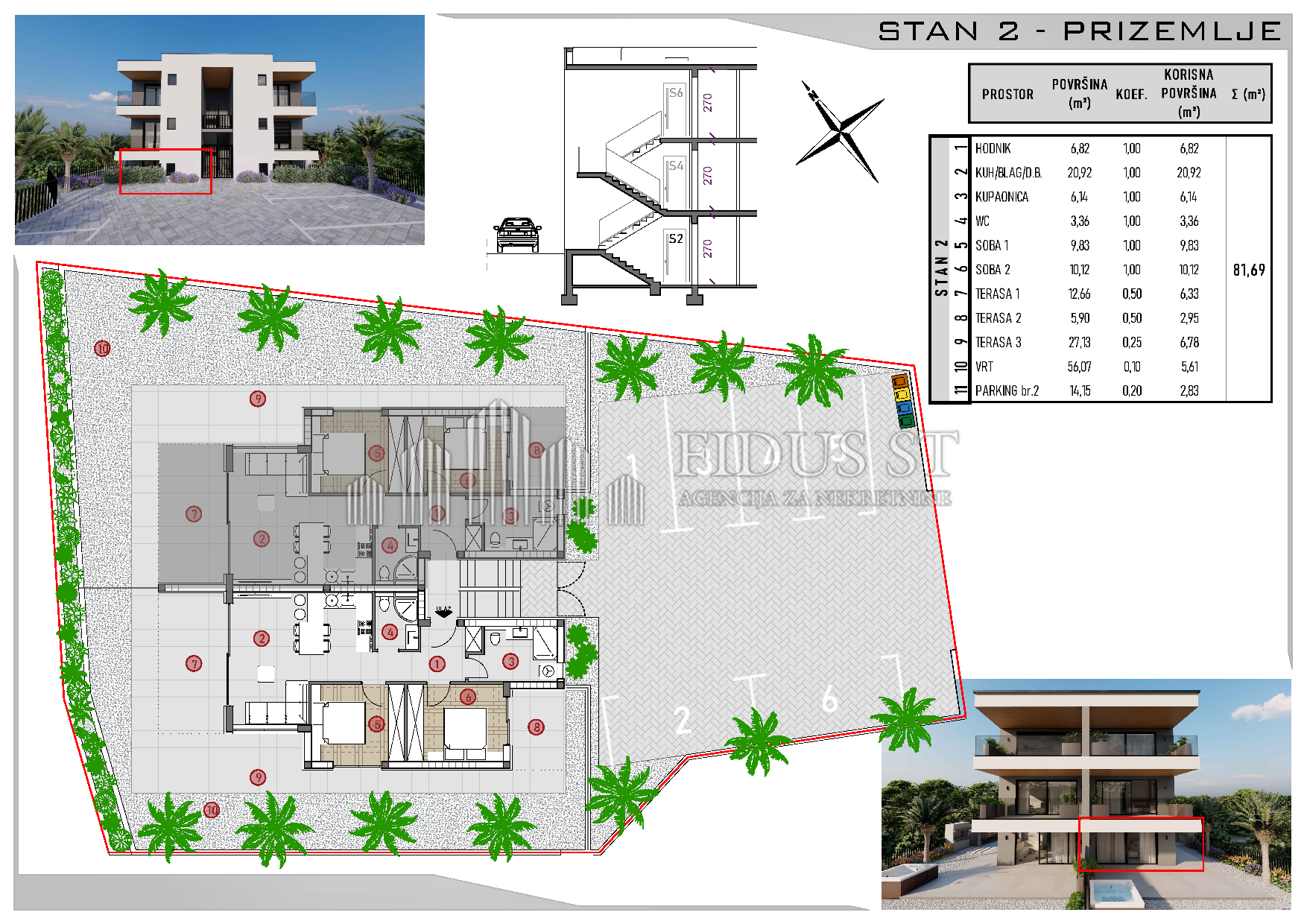 Dvosobni stan 58m2, 3 terase 46m2, vrt 56m2, orijentacija jug-zapad-istok, vlastito parking mjesto 14m2, EC-A+, useljenje početak 2027.